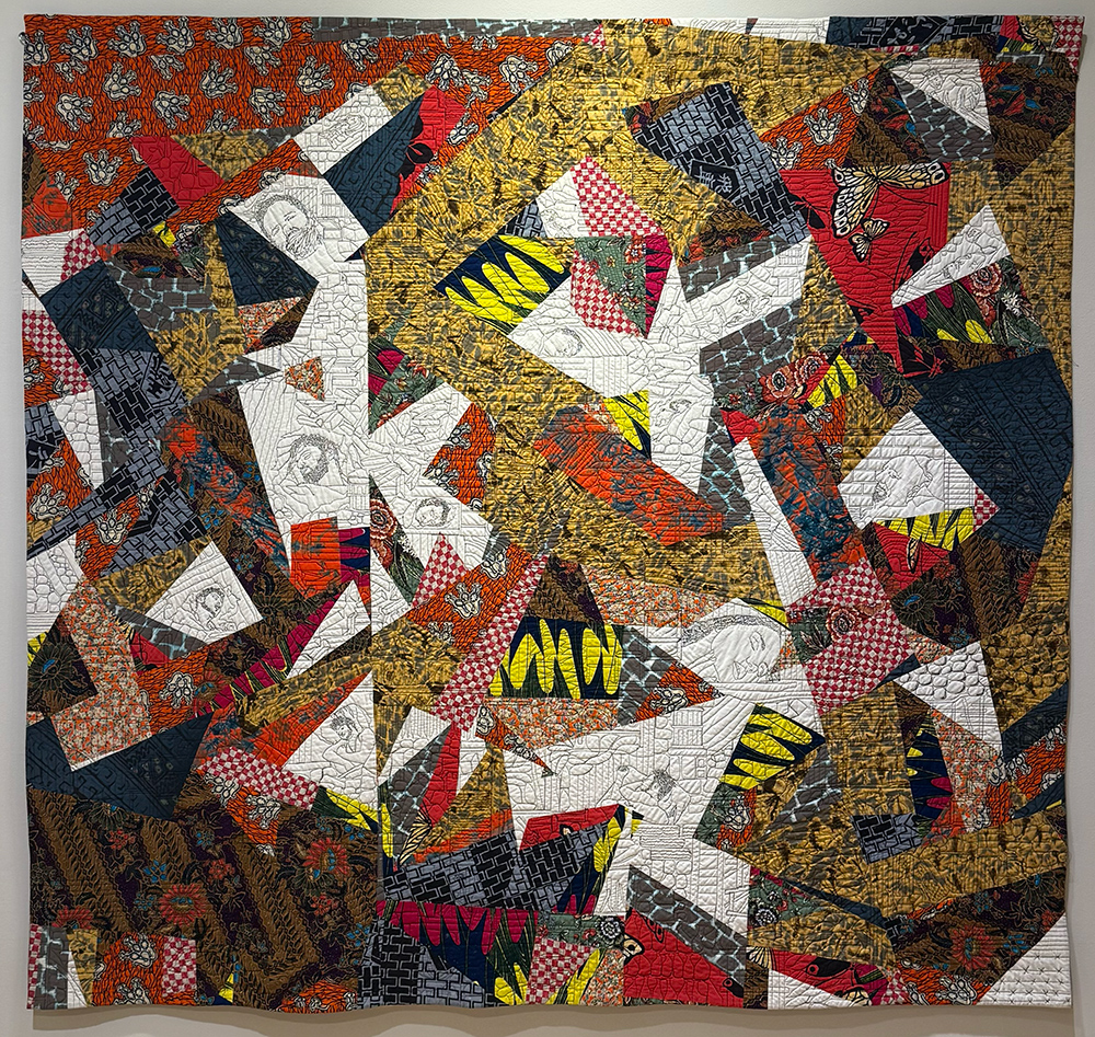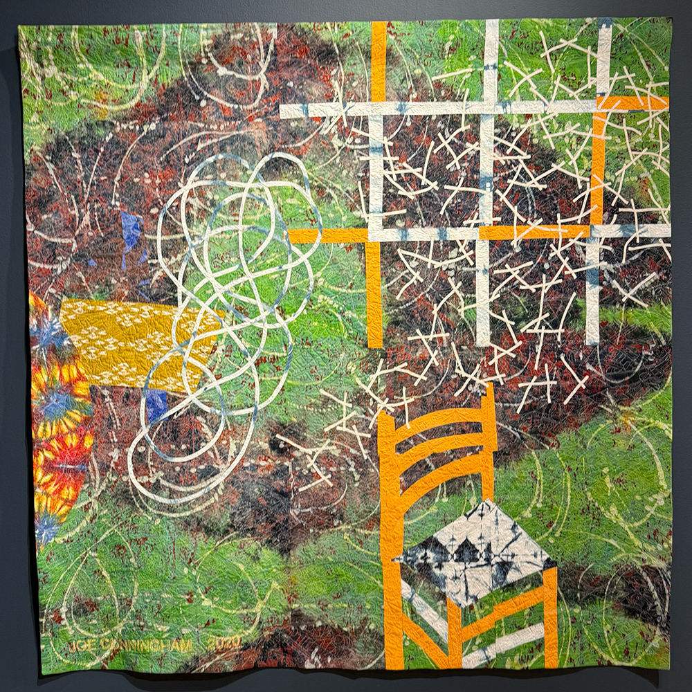 Rest, 2020. Another quilt from the first year of the COVID pandemic, Joe Cunningham made this when he felt he needed a place to sit down and rest to avoid more bombardment with election and pandemic news. When he saw a picture of Vincent Van Gogh’s straw-seated chair, he knew he could steal the image and incorporate it into his quilt. For the artist, the tricky part was integrating it into the body of the quilt and creating a sort of whirlwind of elements all around it. Some of the whirling lines were part of the fabric, and some were his bias tape sewn down to imitate the printed ones. The background fabric is repurposed; it comes from a textile training center in Ghana, where participants experiment with printing, dyeing, and bleaching.