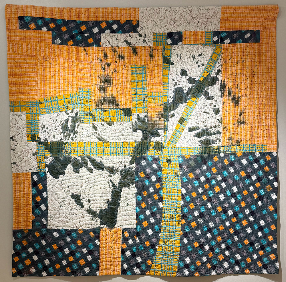 Top Kill, 2010. When the Deepwater Horizon oil spill occurred in April of 2010 and continued for months, Joe Cunningham’s feeling of helplessness was a daily burden as engineers tried technique after technique to stop the millions of gallons of oil from flowing freely out of the damaged pipe. At the same time, the artist was working on a quilt top that he felt was not finished and was unsatisfying, something he did not want to quilt and present to the world. When the company came up with the idea of stuffing debris down the pipe to stop the spill, another unsuccessful technique, they called it “Top Kill.” Cunningham’s own unhappy quilt top was hanging on his studio wall, and he realized he could put it into a brand-new category if he addressed the oil spill. To accomplish this, he opened a bottle of India ink and threw ink all over it to create his own “oil spill.” Then, he quilted it by hand in lines similar to the containment booms that floated around the oil on the surface.
