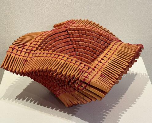 Karyl Sisson is drawn to common manufactured objects – clothespins, zippers, cloth tape measures and paper drinking straws. These undervalued materials serve as her inspiration, reminding her of her childhood. Her artistic practice embraces recycling and repurposing these everyday items, transforming them into sculptures and wall art through simple interlocking techniques found in basketry and needlework. The artwork, like the process that creates it, is laden with patterning and repetition, referencing themes of connection, containment and touch. Sisson finds inspiration in the beauty and simplicity of indigenous and animal architecture, organic growth, and patterns found both in nature and human constructs.