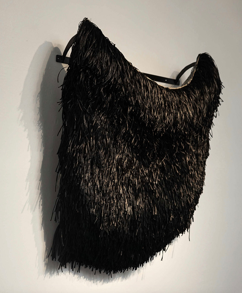 Jeanne Medina Le is a Filipina-American Los Angeles-based artist currently head of the Fiber Program at CSU-Long Beach. Jeanne uses textiles to investigate the language, meaning, and knowledge embodied in the relationship textiles share with the body. She weaves large-scale works she calls “body objects” performed with and on the body. This weaving, Prayers for Estela Crudo, was created during the time when Jeanne’s grandmother was bedridden after a stroke, and Jeanne could not be with her. It is woven from thousands of rug knots made of Synthetic Rayon Raffia, whose physical presence evokes an emotional heaviness, laden withhours of prayers and the labor required to complete the work. When the work is not being interacted with in performance, it is displayed on a steel armature on the wall.