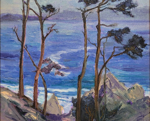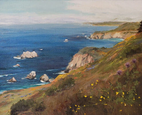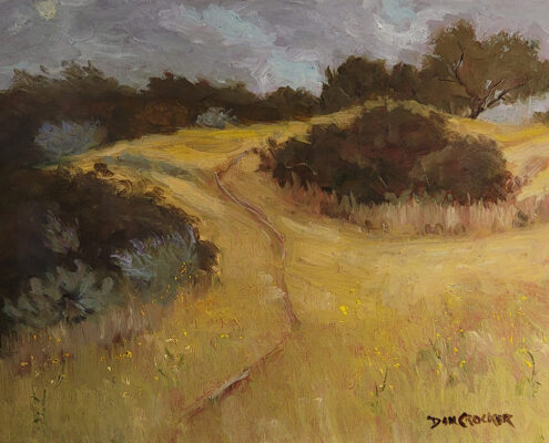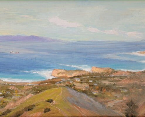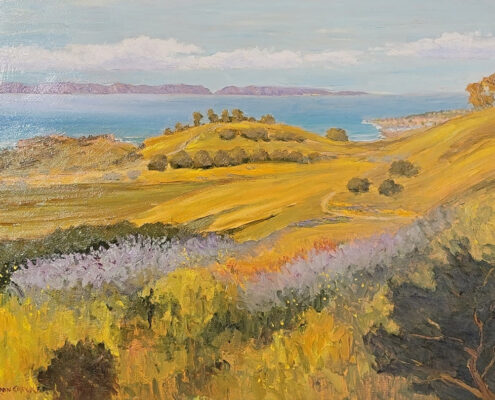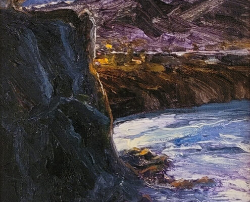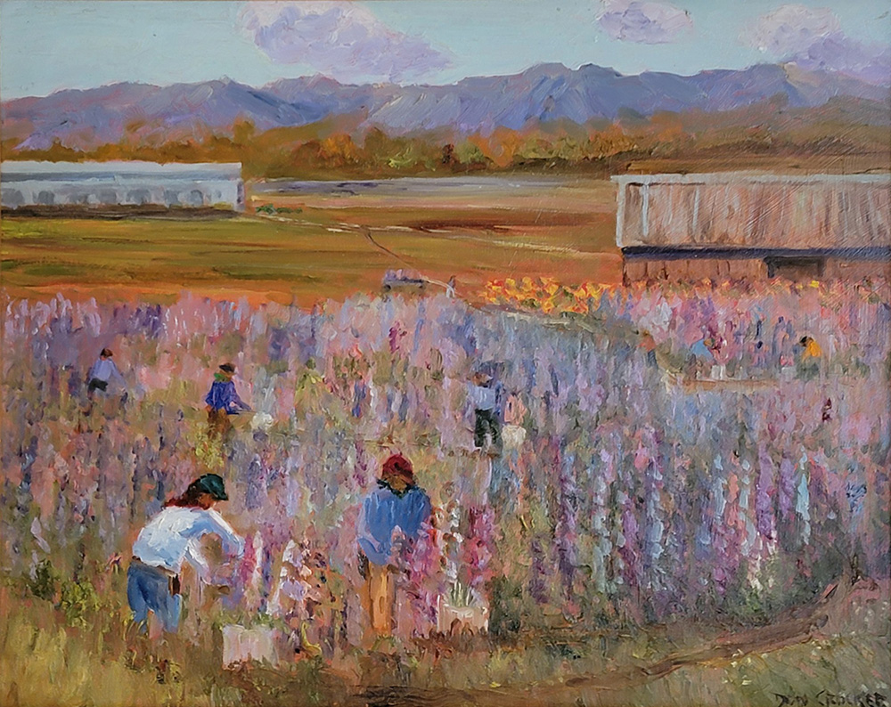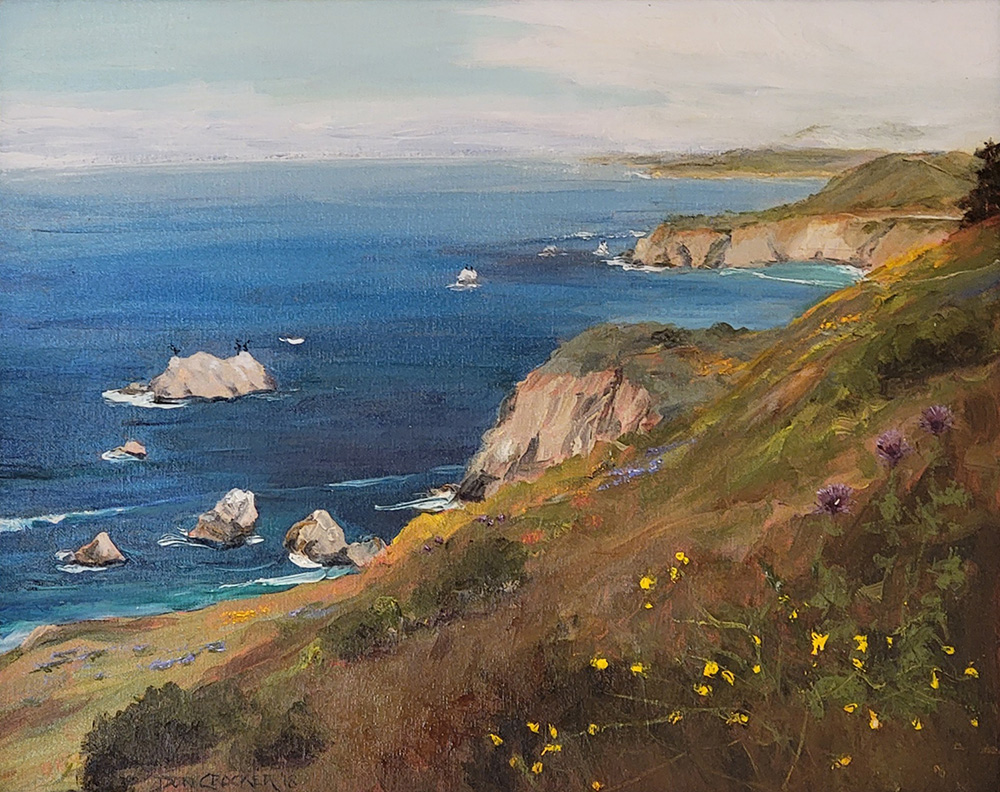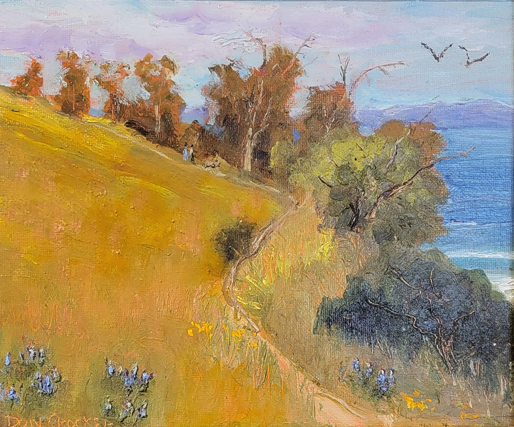A native Californian, Crocker’s love of place began in his youth as an avid hiker with the Scouts and Sierra Club. After retiring from successful careers in law and crisis management, he put his full attention into painting seasonal landscapes in a variety of Golden State locations, but is best known for views of his beloved Palos Verdes coastline, captured both day and night, in a plein air style inspired by California Impressionism. The one figural painting, Flower Harvesters, is what remains of an early series harkening back to French Impressionist subject matter depicting fieldworkers harvesting their crops in locations such as this in Camarillo, documenting a disappearing landscape. More recently, in a return to the materials he used in his stained glass work, the artist began experimenting with the effects of acid on copper, embracing the unpredictable chemical process and resulting colors achieved with this medium.