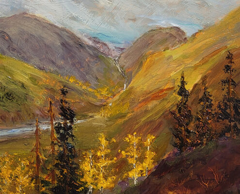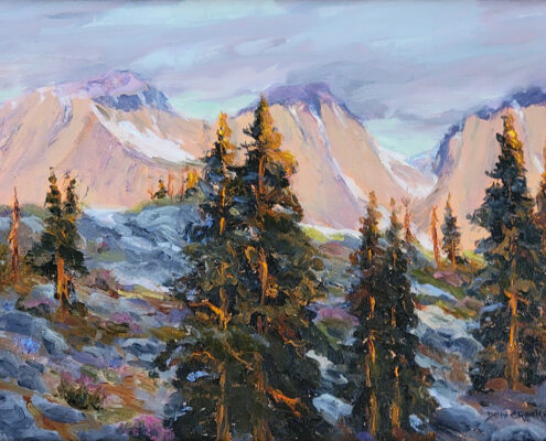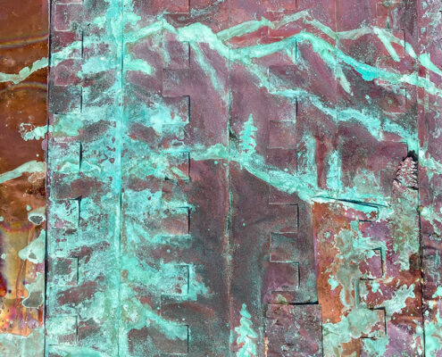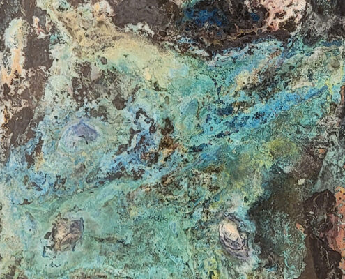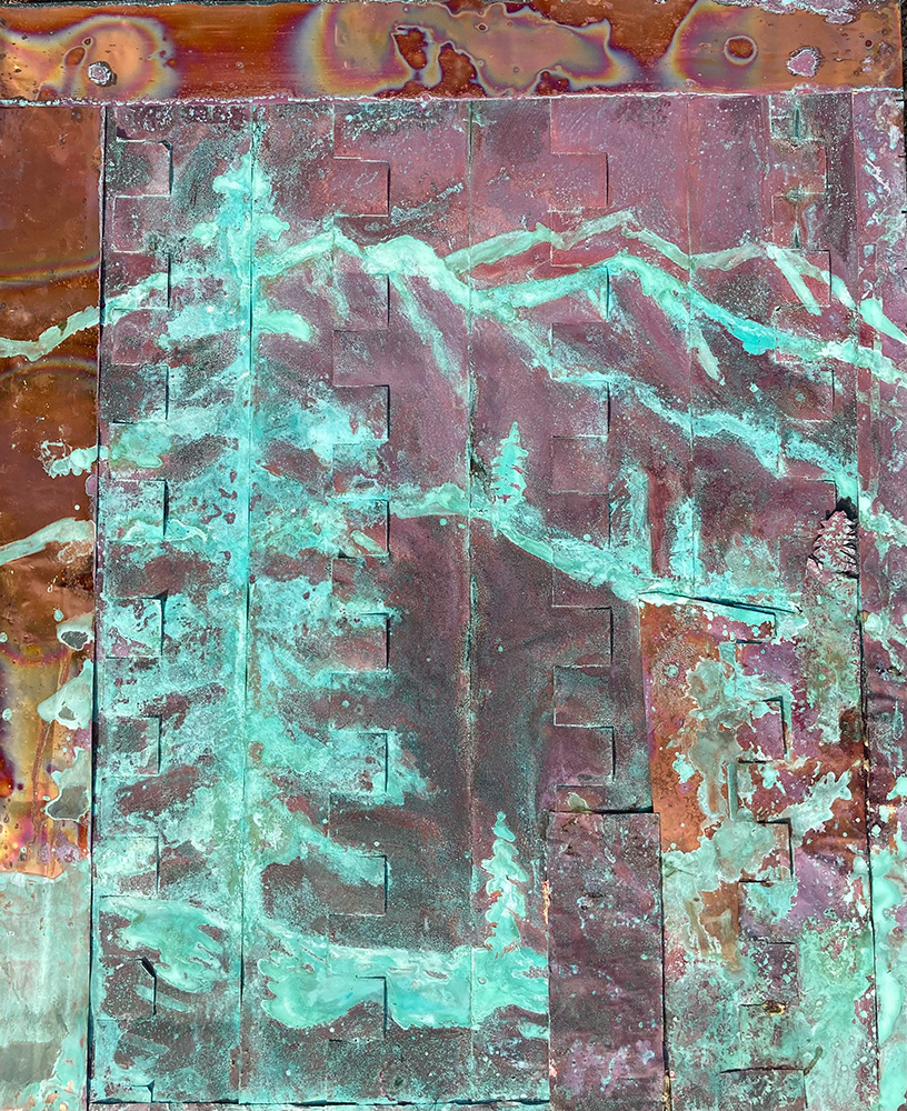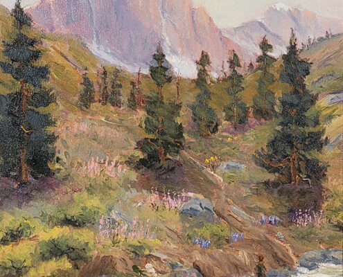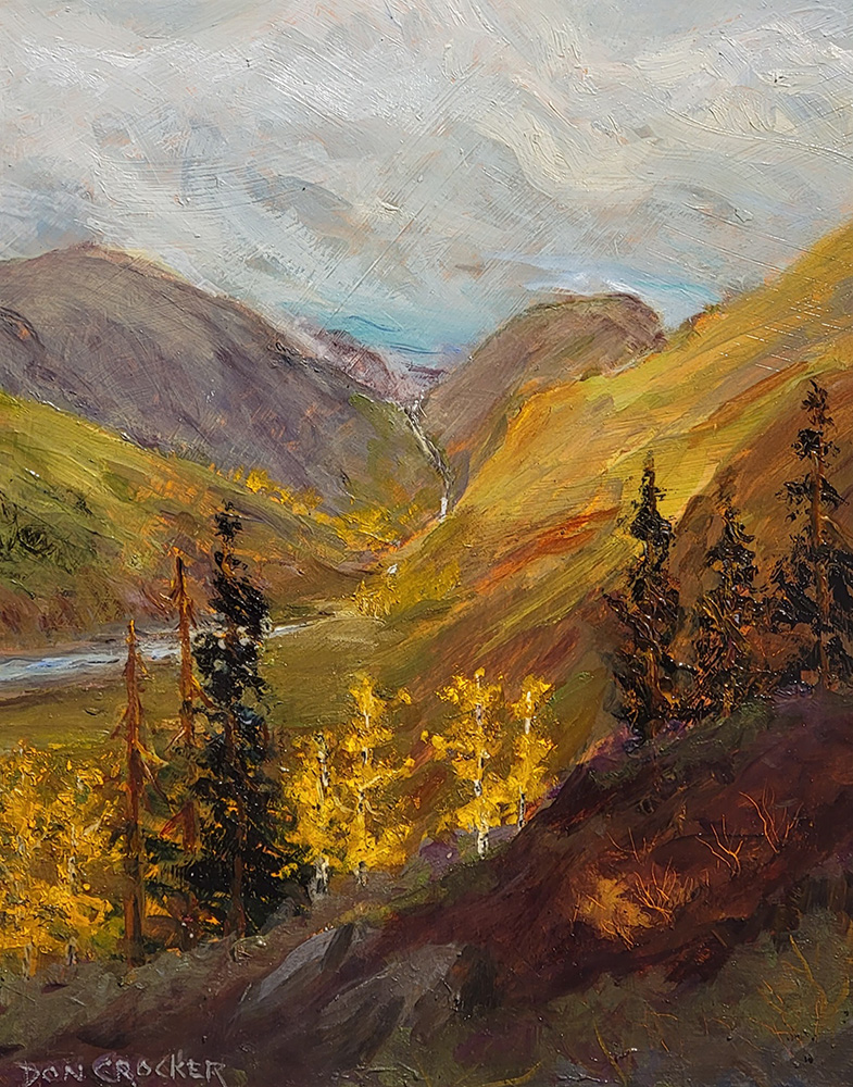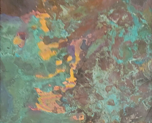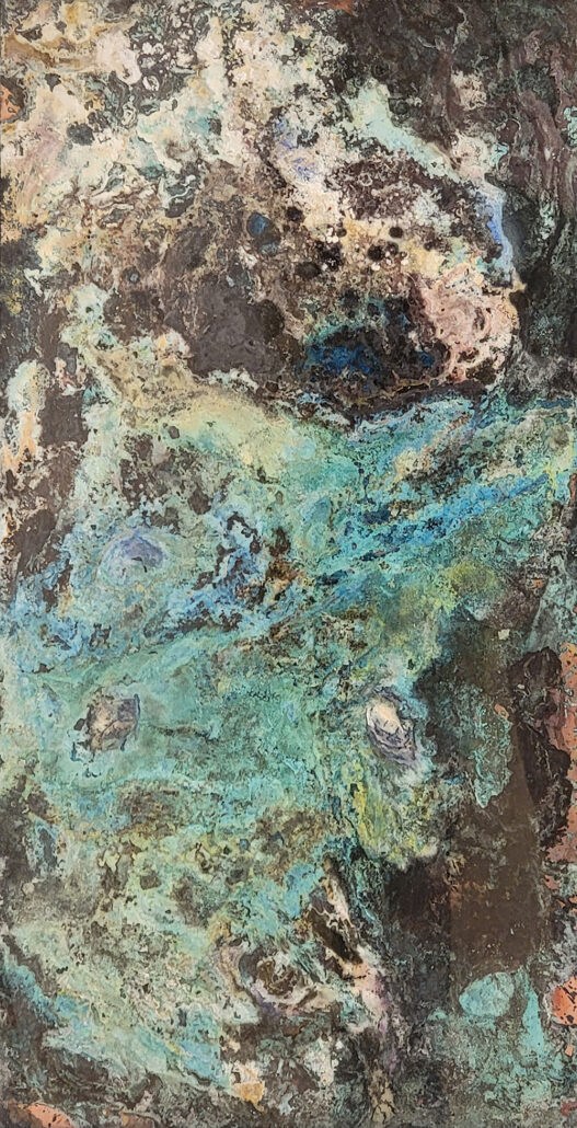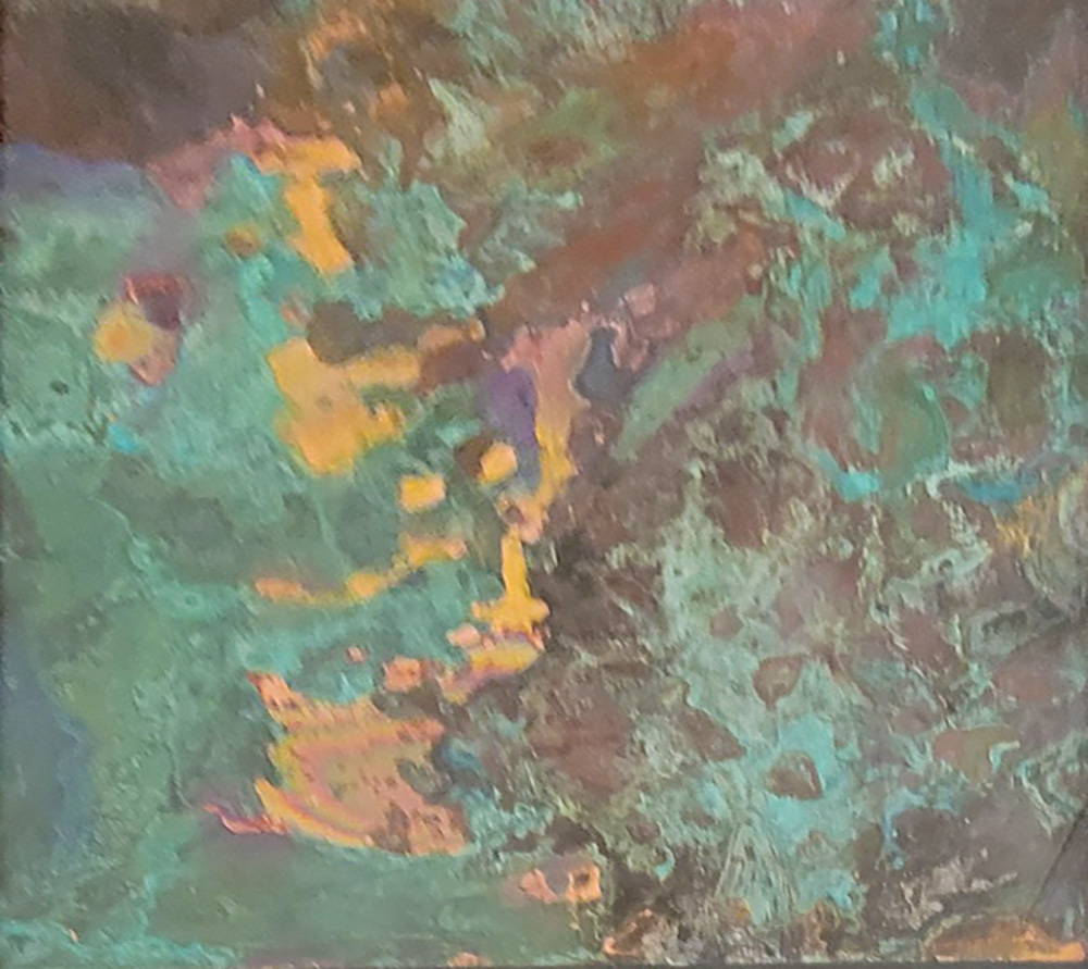 A native Californian, Crocker’s love of place began in his youth as an avid hiker with the Scouts and Sierra Club. After retiring from successful careers in law and crisis management, he put his full attention into painting seasonal landscapes in a variety of Golden State locations, but is best known for views of his beloved Palos Verdes coastline, captured both day and night, in a plein air style inspired by California Impressionism. The one figural painting, Flower Harvesters, is what remains of an early series harkening back to French Impressionist subject matter depicting fieldworkers harvesting their crops in locations such as this in Camarillo, documenting a disappearing landscape. More recently, in a return to the materials he used in his stained glass work, the artist began experimenting with the effects of acid on copper, embracing the unpredictable chemical process and resulting colors achieved with this medium.