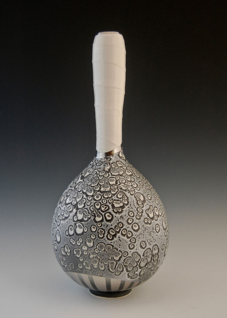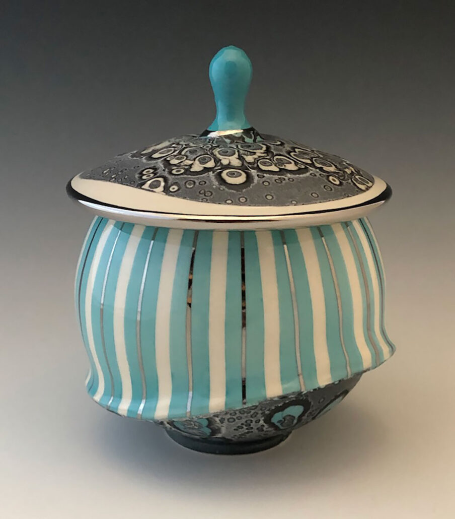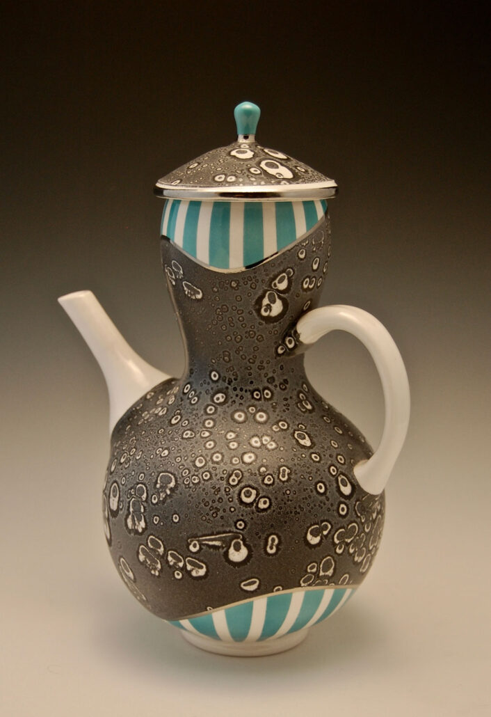 Current work is all wheel-thrown multi-fired porcelain. A typical pot is fired up to 4 times with a max temperature reaching cone 6 in an electric kiln. Used in my process are multiple layers of sprayed and brushed; slips, underglazes, glazes, and decals. Lastly pots are finished with a layer of brushed luster, fired to cone 019.