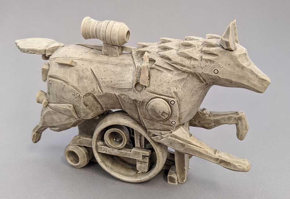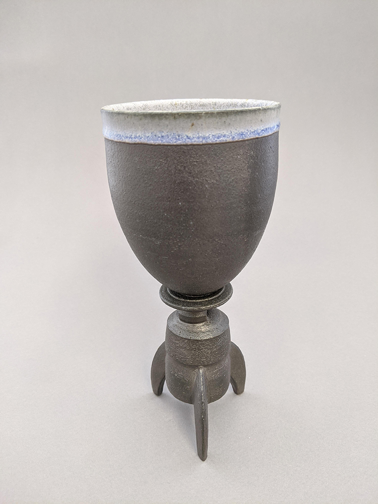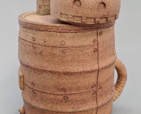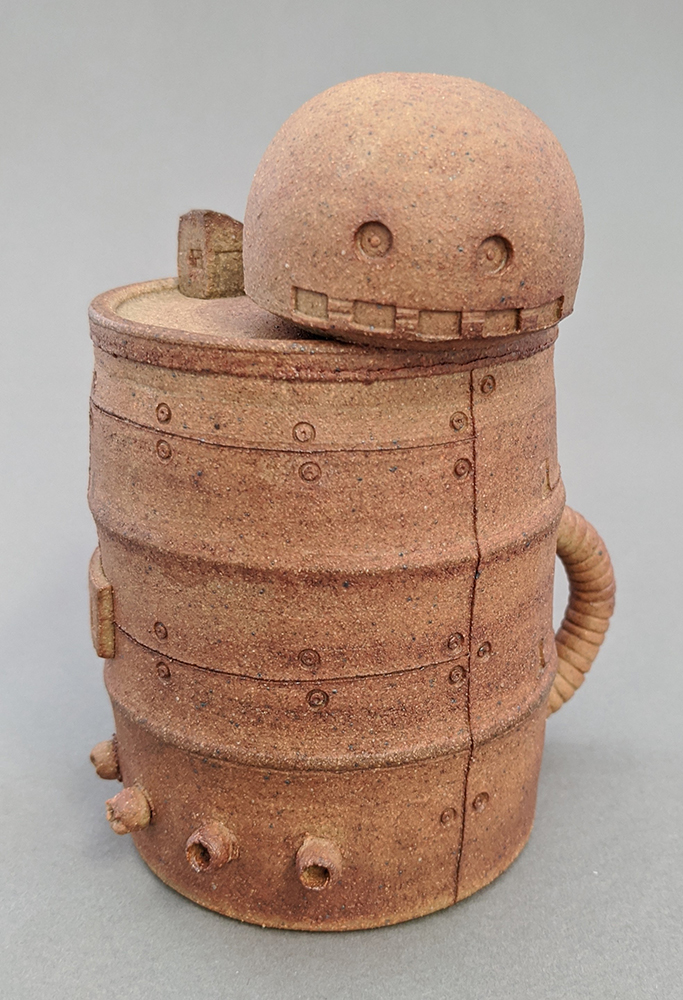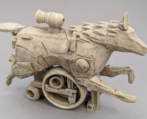 The pieces are made on a pottery wheel and combined with hand sculpting to add multiple clay parts. Depending on my idea, I choose to either throw the main body or hand sculpt. All the smaller elements are mostly made on the wheel achieving machine-like parts using straight edges instead of my hands to achieve a clean-edge look. By using these tools and techniques, I’m able to make my ideas come to life through a form of ceramics that emphasizes assembly.