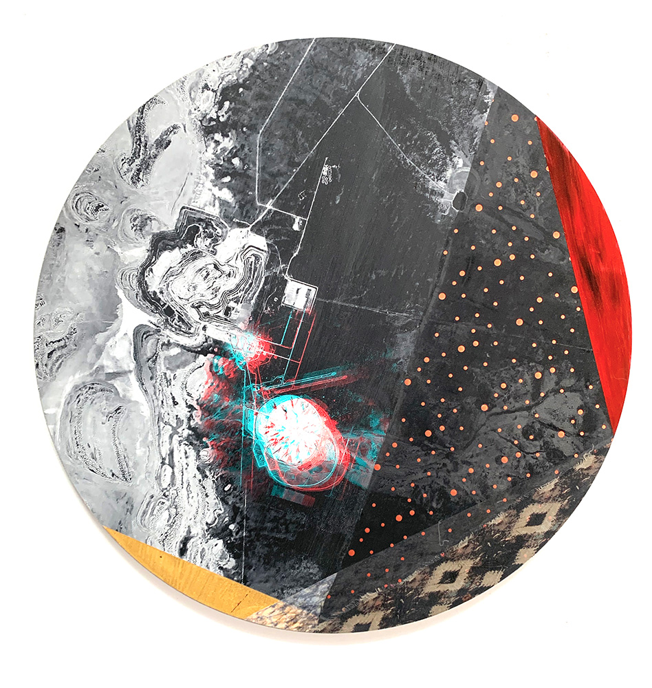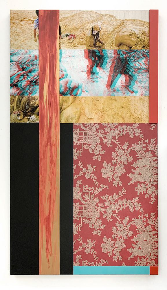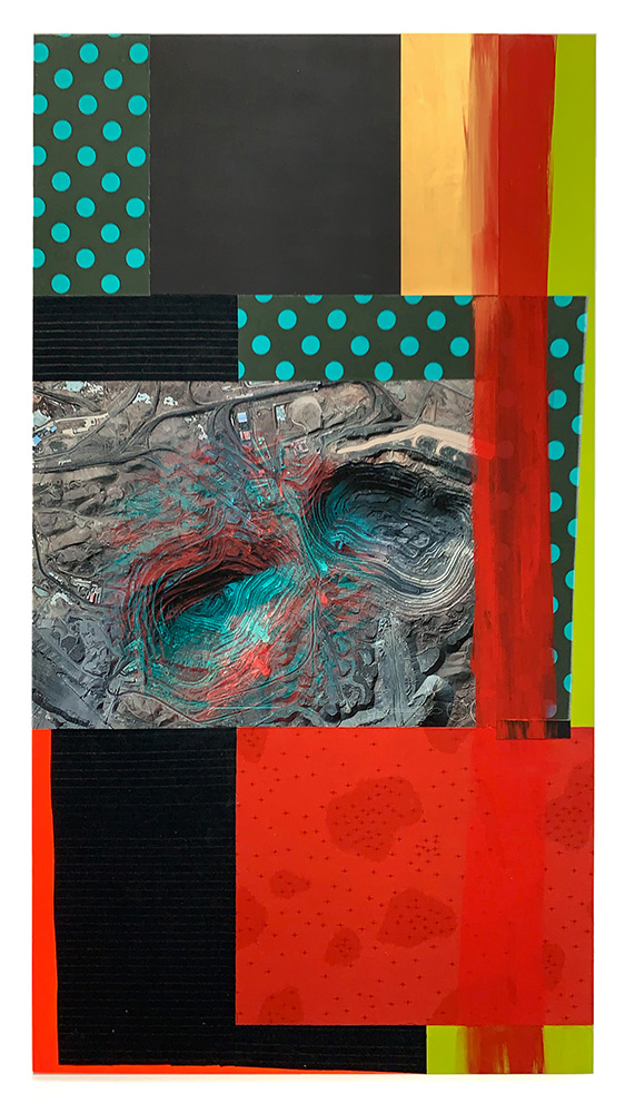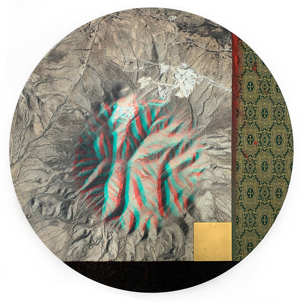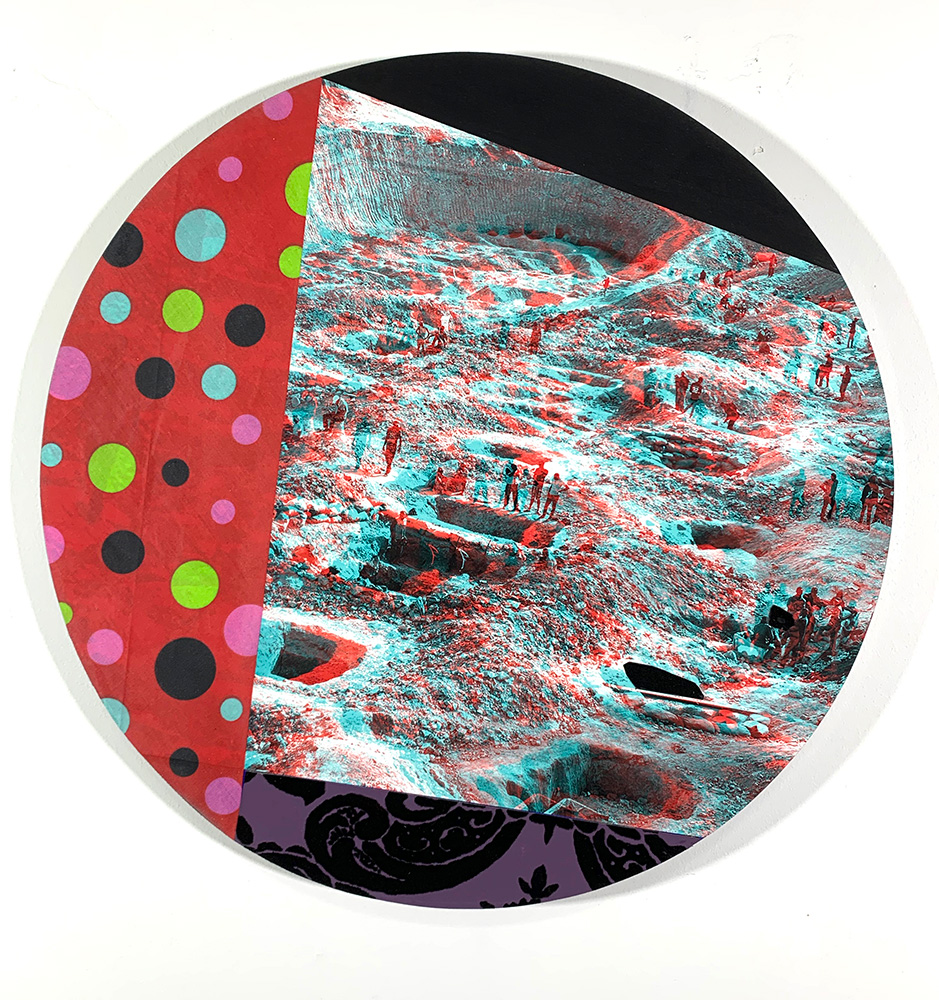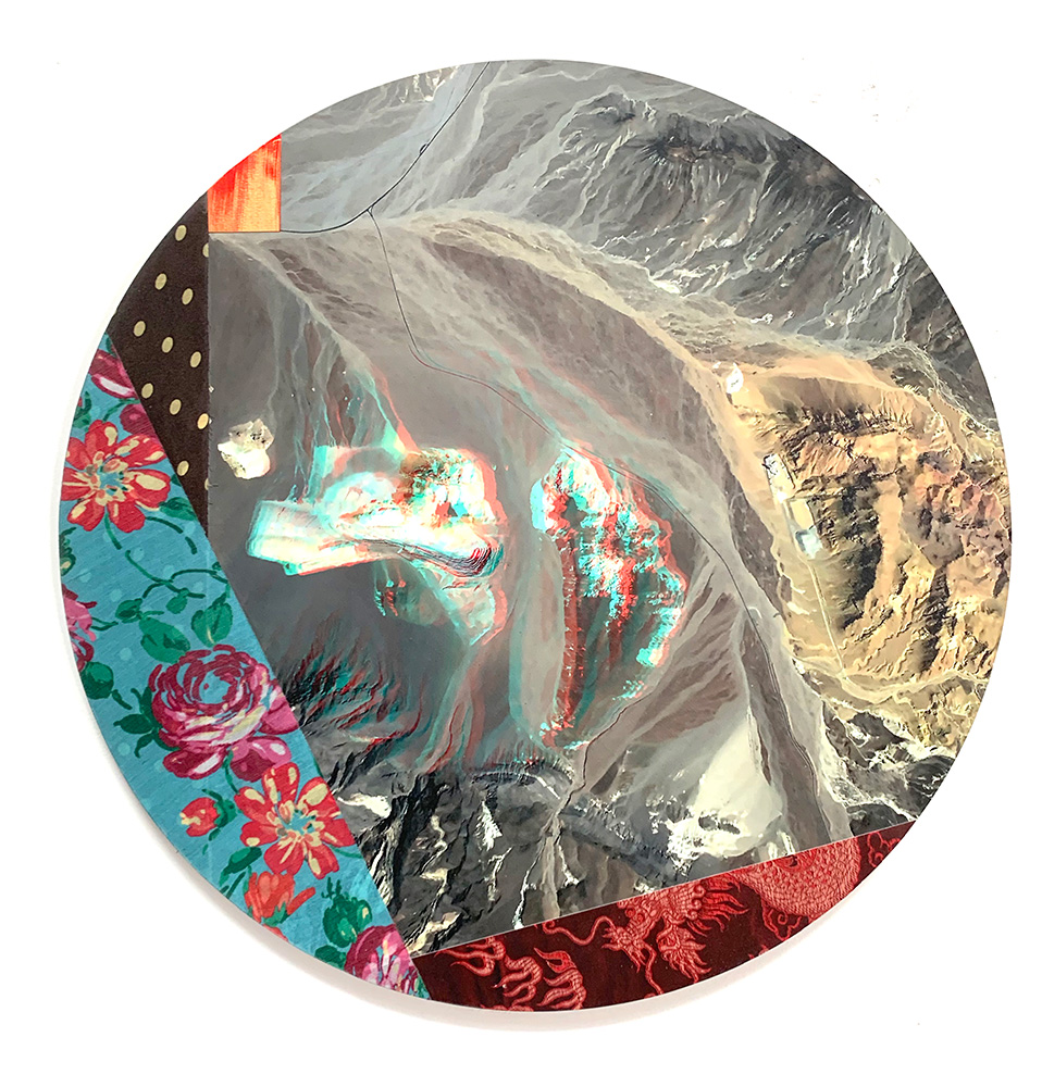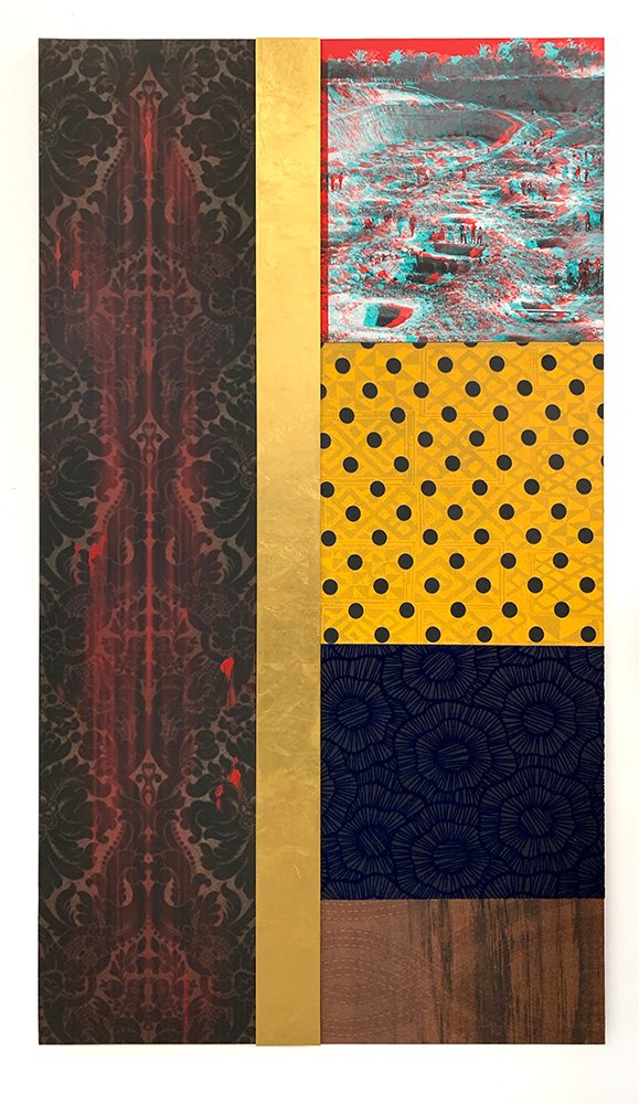 Each Rare Earth artwork includes an archival image of a specific mine rendered in classic 3D  (anaglyph) off-registration referencing mid-century exuberant optimism, geo-political history, cultural signifiers, symbolic design patterns and phenomena. They are built from a collection of found materials, fabrics, wallpapers, digital imagery, paint, and precious metals. The digital Landsat image is positioned in juxtaposition to the other compositional elements to create a disruptive collage/painting of spacial contradictions, surface/depth and multiple cultural interpretations.”