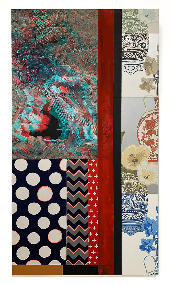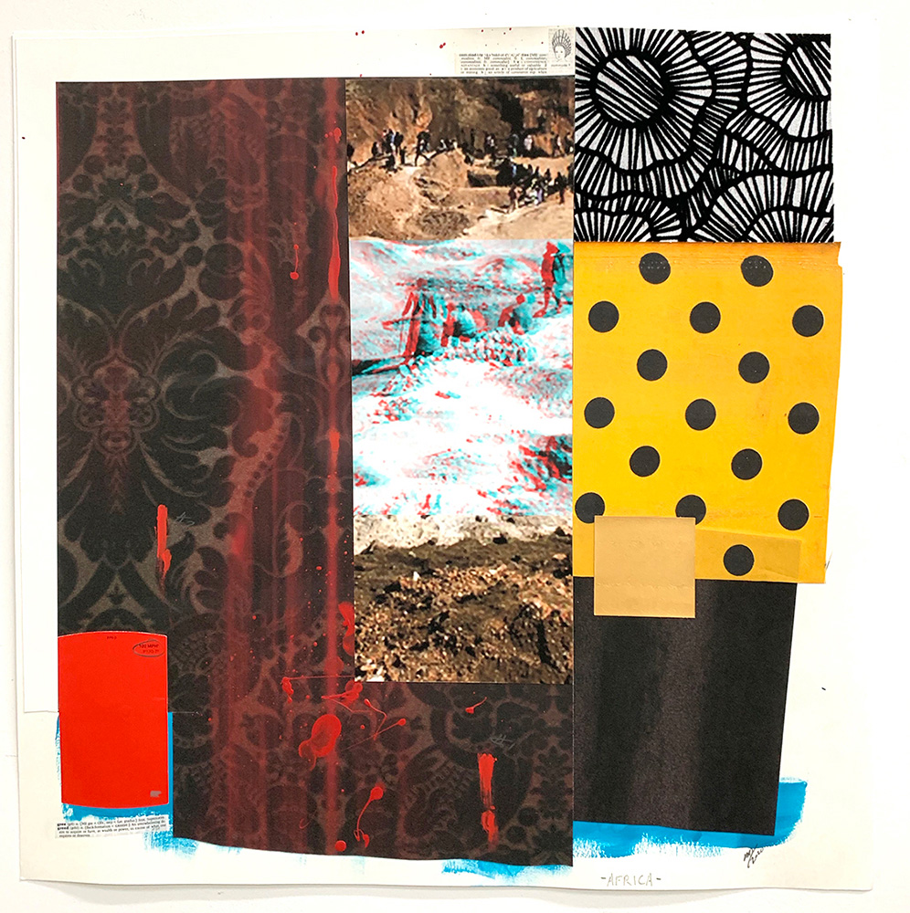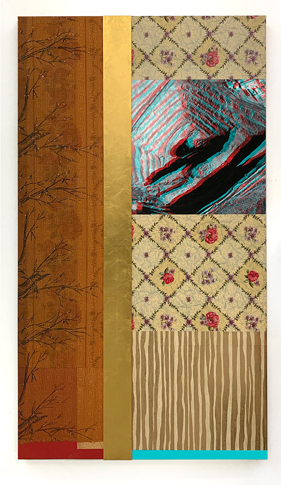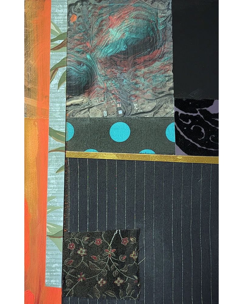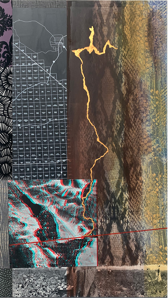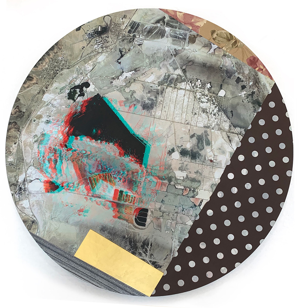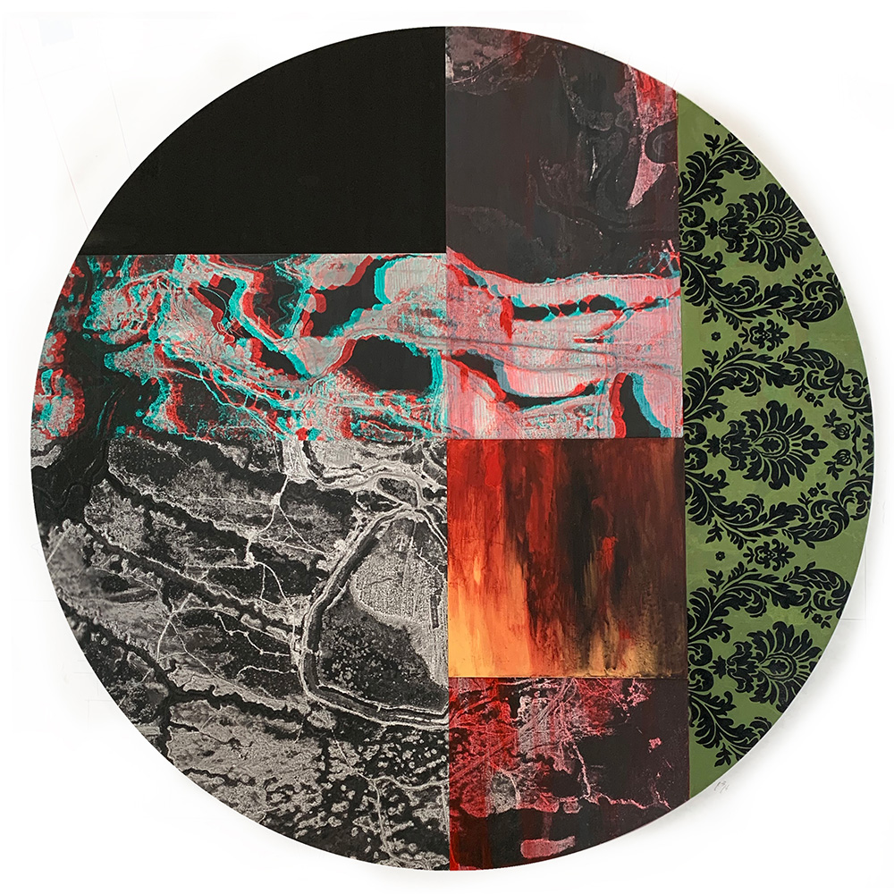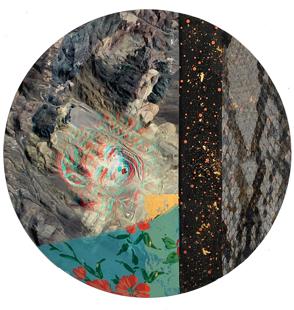 Each Rare Earth artwork includes an archival image of a specific mine rendered in classic 3D  (anaglyph) off-registration referencing mid-century exuberant optimism, geo-political history, cultural signifiers, symbolic design patterns and phenomena. They are built from a collection of found materials, fabrics, wallpapers, digital imagery, paint, and precious metals. The digital Landsat image is positioned in juxtaposition to the other compositional elements to create a disruptive collage/painting of spacial contradictions, surface/depth and multiple cultural interpretations.”