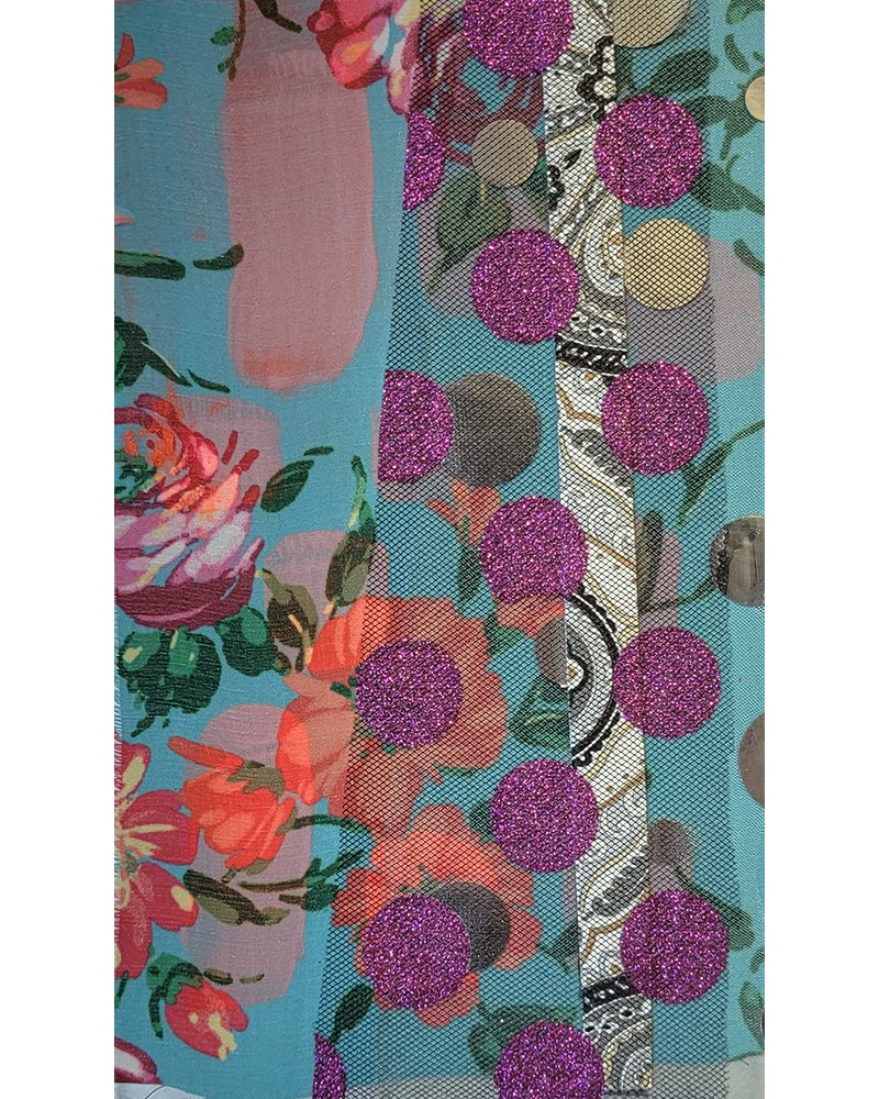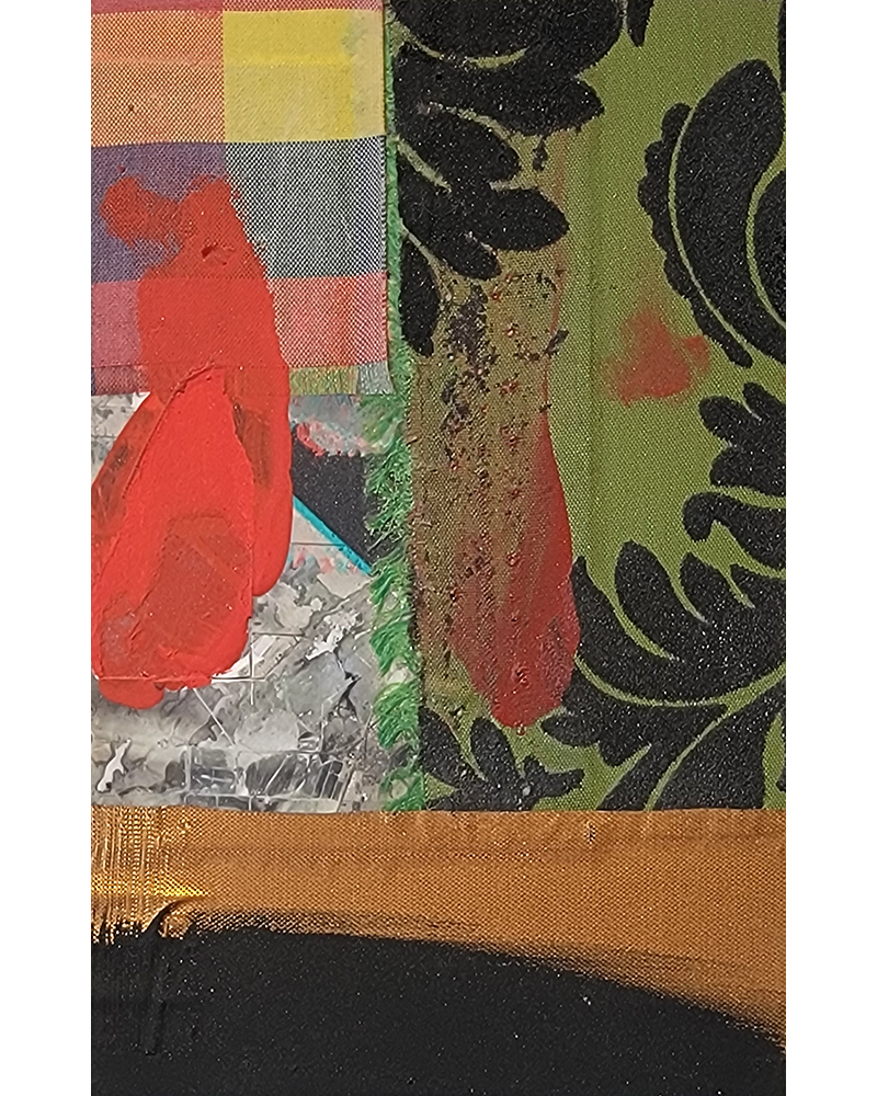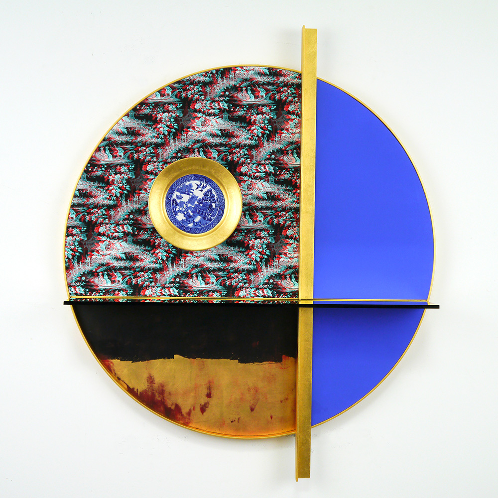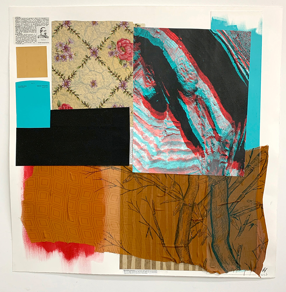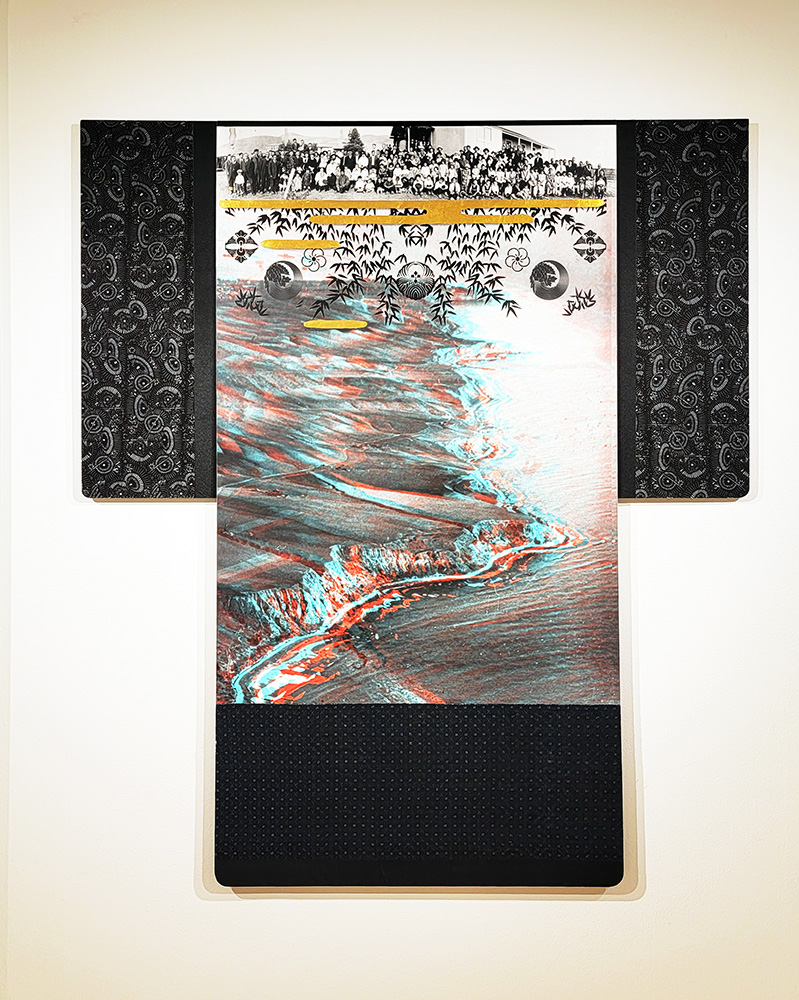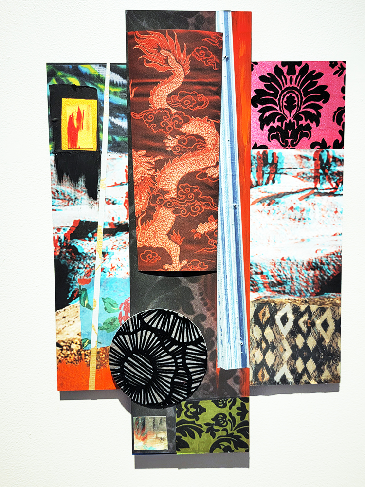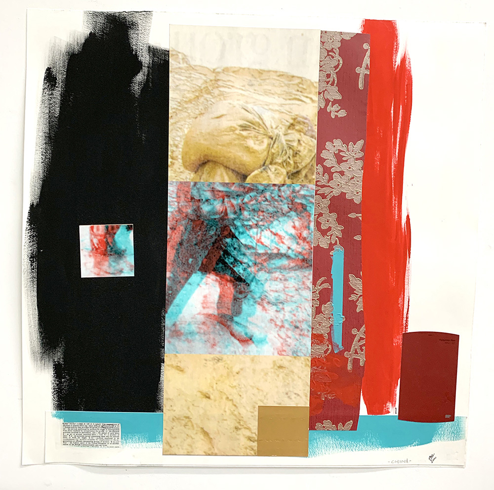 Each Rare Earth artwork includes an archival image of a specific mine rendered in classic 3D  (anaglyph) off-registration referencing mid-century exuberant optimism, geo-political history, cultural signifiers, symbolic design patterns and phenomena. They are built from a collection of found materials, fabrics, wallpapers, digital imagery, paint, and precious metals. The digital Landsat image is positioned in juxtaposition to the other compositional elements to create a disruptive collage/painting of spacial contradictions, surface/depth and multiple cultural interpretations.”