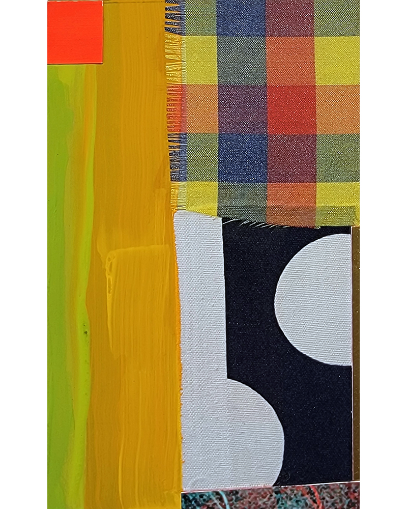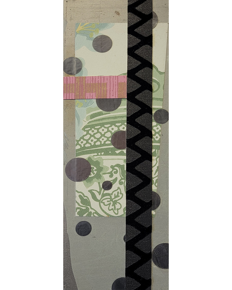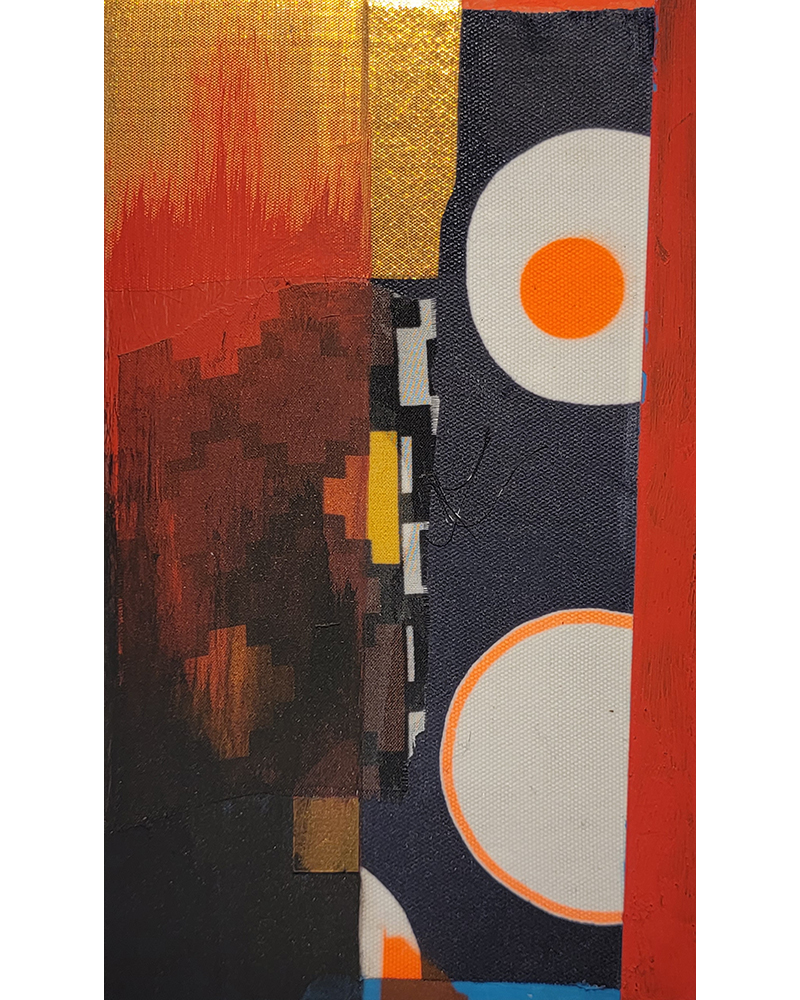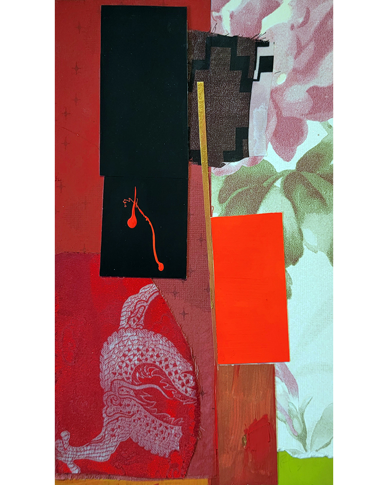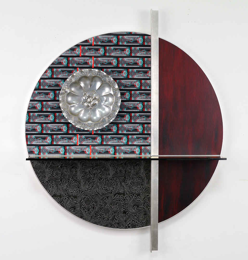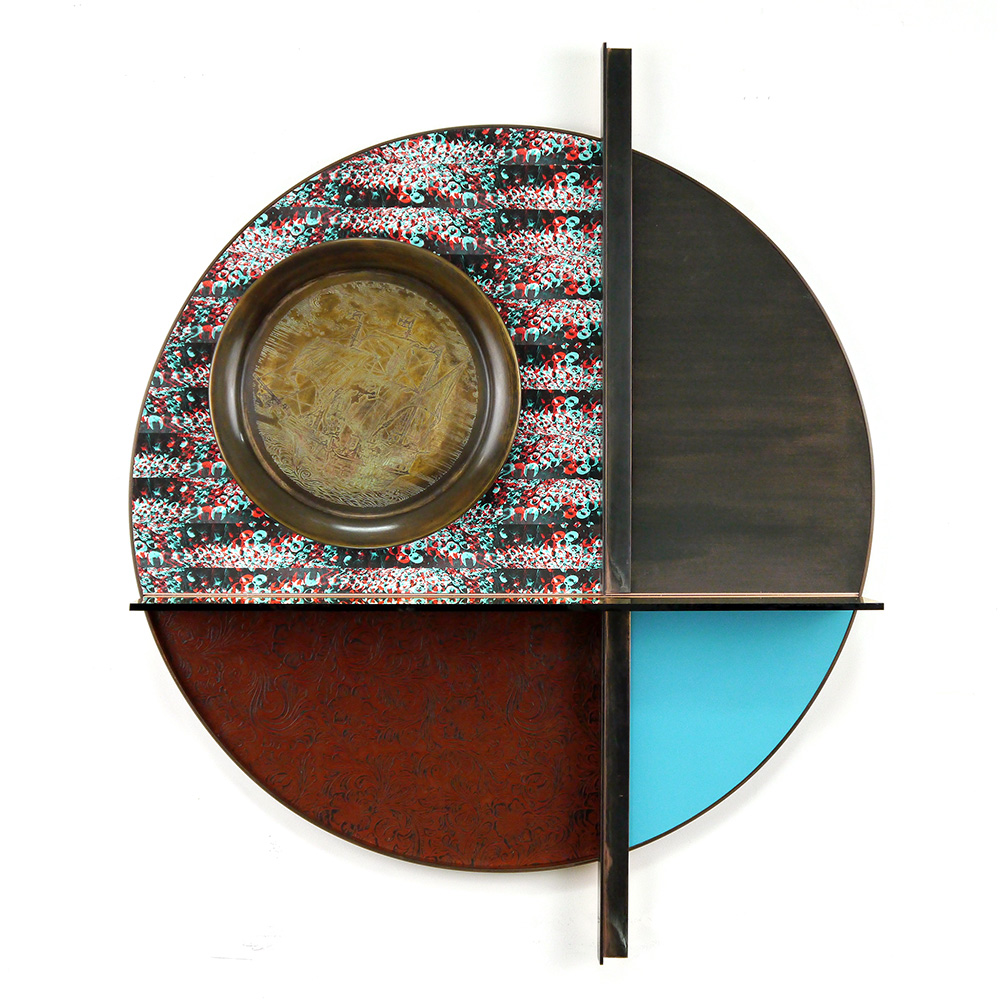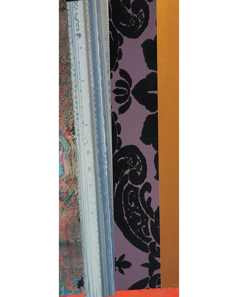 Each Rare Earth artwork includes an archival image of a specific mine rendered in classic 3D  (anaglyph) off-registration referencing mid-century exuberant optimism, geo-political history, cultural signifiers, symbolic design patterns and phenomena. They are built from a collection of found materials, fabrics, wallpapers, digital imagery, paint, and precious metals. The digital Landsat image is positioned in juxtaposition to the other compositional elements to create a disruptive collage/painting of spacial contradictions, surface/depth and multiple cultural interpretations.”