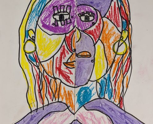 Drawing continuous lines with a black Sharpie, students created an abstract, expressive portrait inspired by the many styles of Pablo Picasso. Color was applied and blended with oil pastels while thinking about various color schemes. Cutting it out and standing it up transformed the artwork from 2D to 3D.