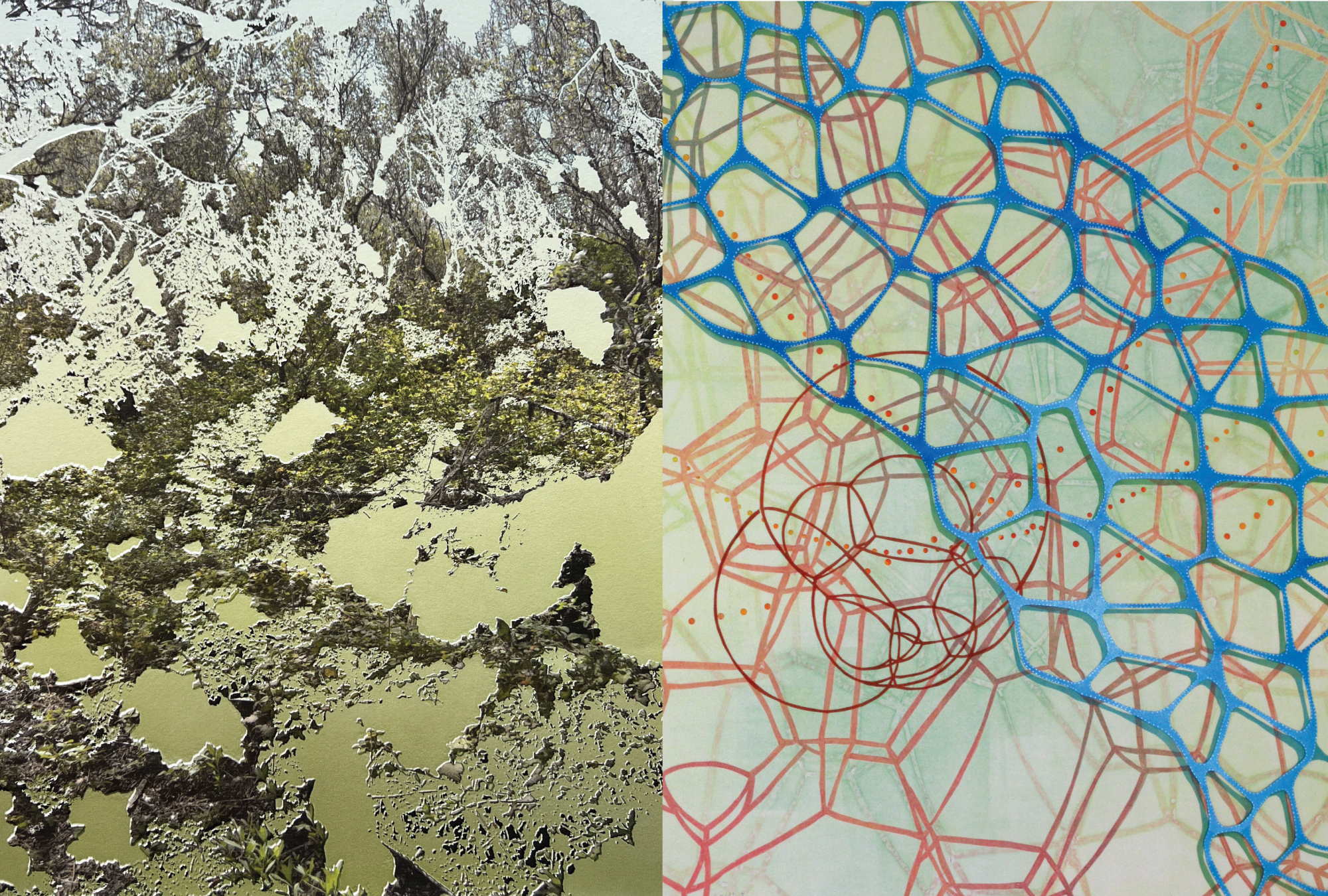 LEFT: Tava Tedeso, Applied Greenery, 2014, digital and relief print (detail). RIGHT: Kimiko Miyoshi, Spill I, 2013, layered monotype, hand worked (detail).