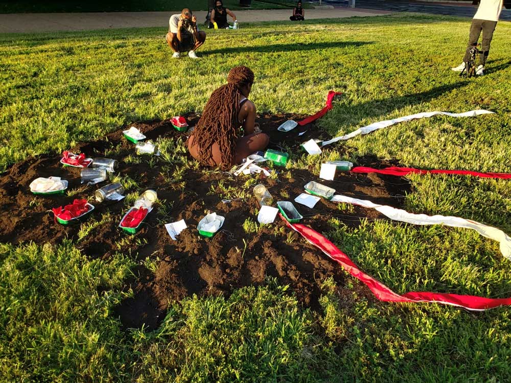 As the USA continued to suffer through countless deaths, rising unemployment, and exacerbated social injustices amplified by CV19, artists adapted to survive while honoring ‘stay at home’ policies. Simultaneously, protests and civil unrest gained momentum after the consecutive murders of Black, Indigenous, and Latinx Americans by law enforcement officers. Phased re-opening was implemented in early summer, and janet chose to offer a cathartic performance inviting fellow citizens to create new social contracts based in justice to ‘guide us and our descendants’ out of the predatory and oppressive practices of the American experiment. Amendment: Knell of a Nation is janet’s first outdoor participatory Performance Art in Washington DC during the 2020 worldwide pandemic. It was performed at Lincoln Park on Capitol Hill near the Emancipation Memorial, which was erected in 1876.