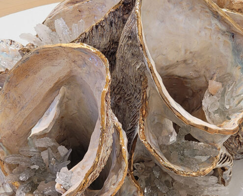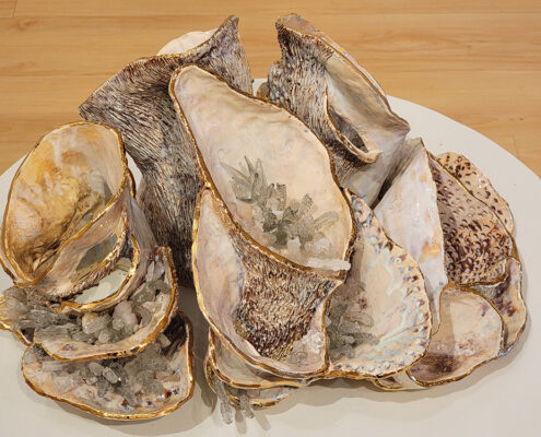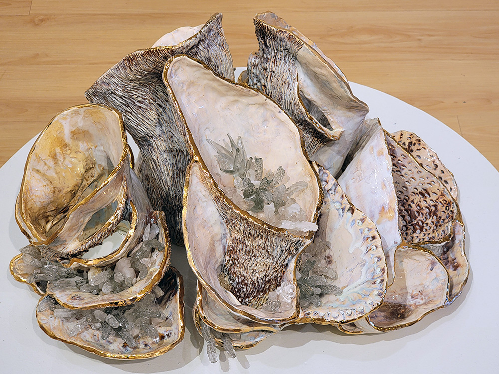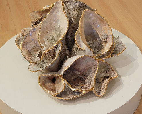 Nicole Stahl, We Need a Forest Fire (from the Transplants series), 2022, Hand-built ceramic, gold luster, cast glass, crystals, epoxy, 15 x 22 x 29 in
