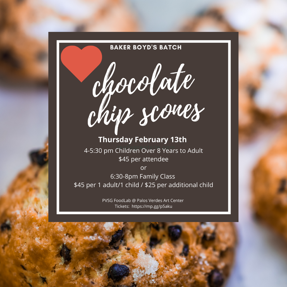 Palos Verdes Art Center, in partnership with Palos Verdes School Gardens, presents VALENTINE SCONES WITH BAKER BOYD’S BATCH, an introductory scone making workshop. Nothing is better than a freshly baked, home-made scone. And a chocolate chip scone with its crispy outside, moist interior and slightly melted chocolate is absolutely out of this world! Come and bake these delicious treats with us! You will leave with your own batch of prepared scone dough ready for you to freeze and bake fresh on Valentine’s Day or any day that you are in need of something delicious.
